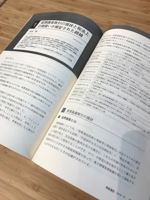 税務経理協会から出版(2019.4.10発売)された「税務通信5月号」の特集記事「仮想通貨に関する税制改正とその影響ー取引実態と法規制から見る現状」の第1章9ページを出筆させていただきました。この特集では、私以外に長瀬威志弁護士、延平昌弥弁護士、伊藤嘉基公認会計士・税理士、峰岸秀幸公認会計士・税理士の第一線で活躍されている先生方とともに特集の記事を出筆させいただいたことは、心から光栄に思っております。そして、税務経理協会の編集者の皆さんには、助けていただき、立派な特集に仕上げていただき感謝しております。本当にありがとうございました。 お送りいただいた雑誌以外にもアマゾンで1冊購入しました。(*アマゾンでも購入できますが、大きな書店でも販売してます。ぜひご覧ください。)