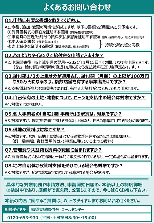 家賃の2/3×6ヶ月分が一括で支給され、個人事業者の自宅兼事務所も対象! 必要書類 ①賃貸借契約書 ②通帳 ③本人確認書類 ④確定申告書 ⑤今年の月別の売上がわかるもの 申請開始日はまだ未定です。