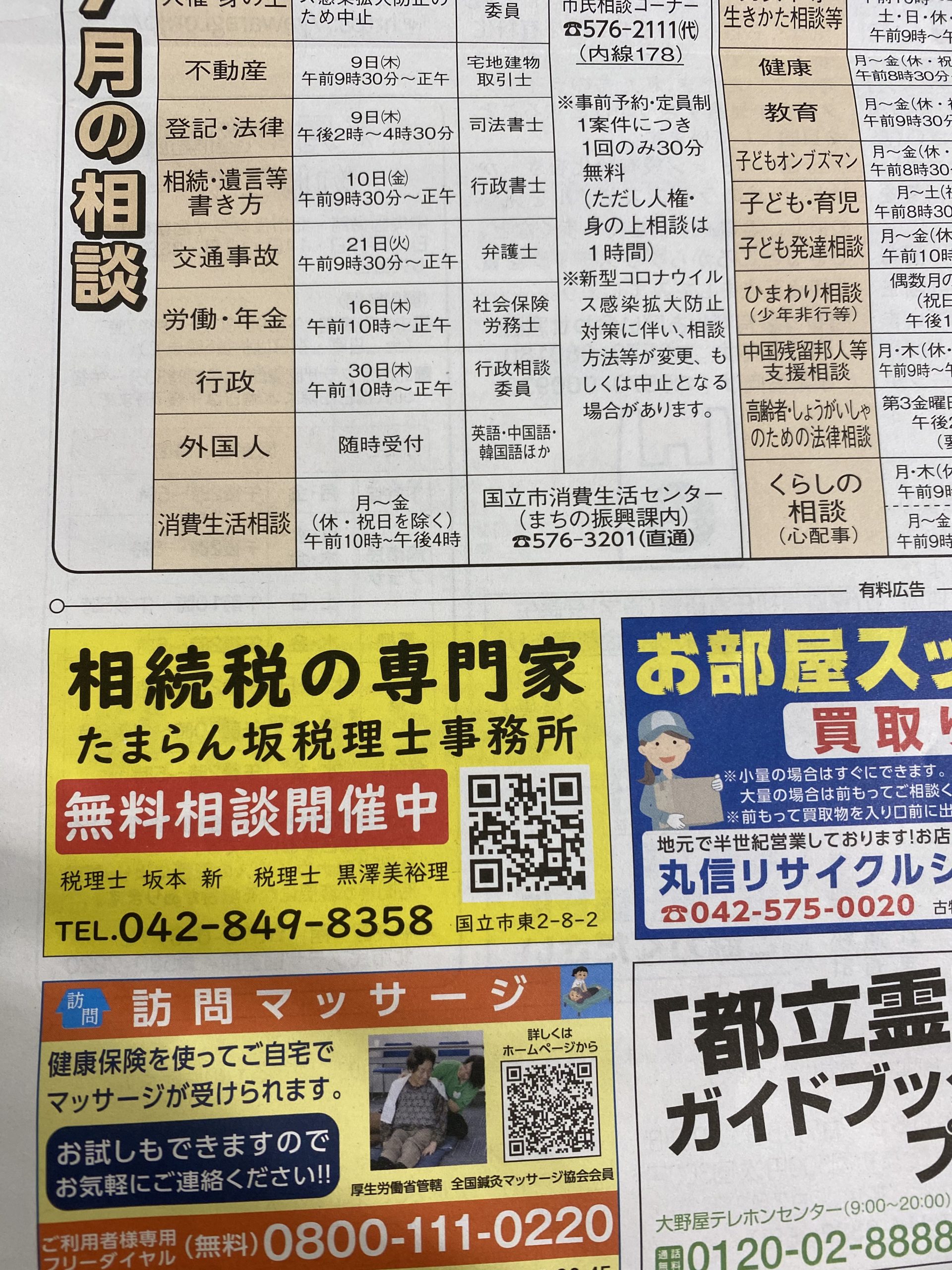 市報 くにたちに広告を出しました。 黄色が、思ったより良い色で安心しました。