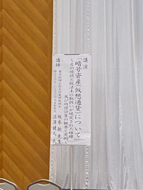 昭島市昭和の森ファレスト・イン昭和館2階 シンバンホールにて「暗号資産(仮想通貨)について~その現状と税法上の取扱いが規定された経緯及び所得計算の概要と実例~」と題して講師をしてきました。皆さん、熱心に聞いていただき、良い経験をさせていただきました。
